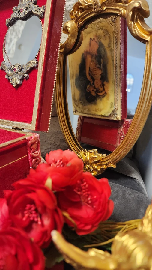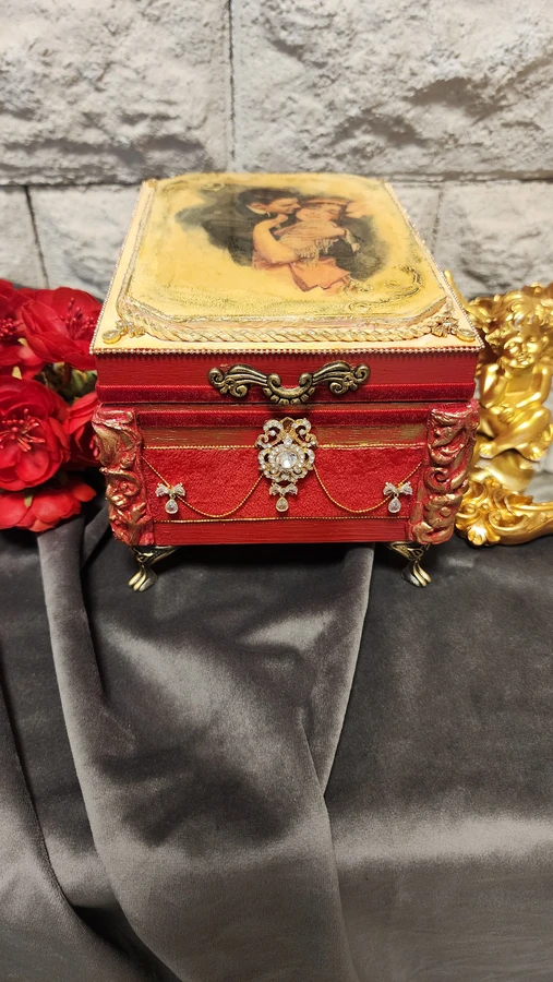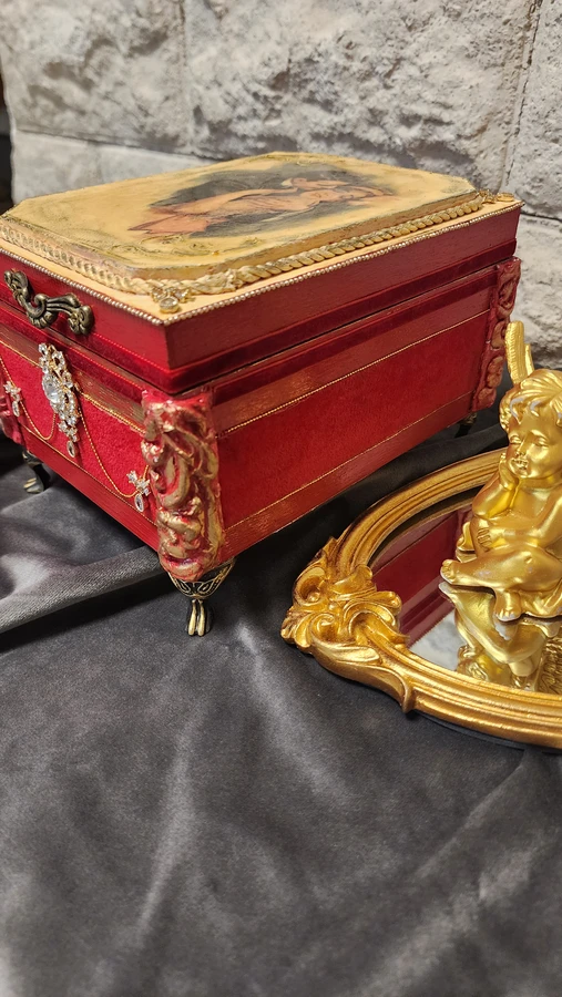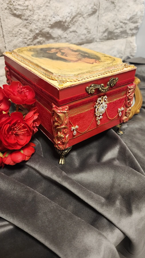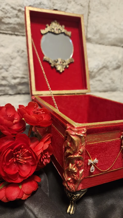 A very romantic jewellery box. Red color, representing love , some embellishments inside and out , makes this beauty a star on your dresser.
